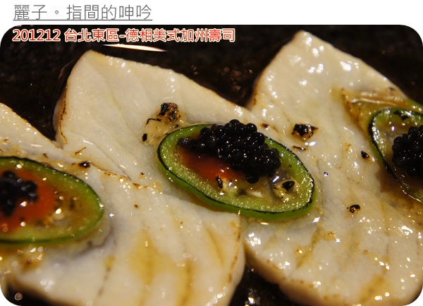 炙燒的生魚片、翡翠辣椒(但不辣)、黑色魚子醬~